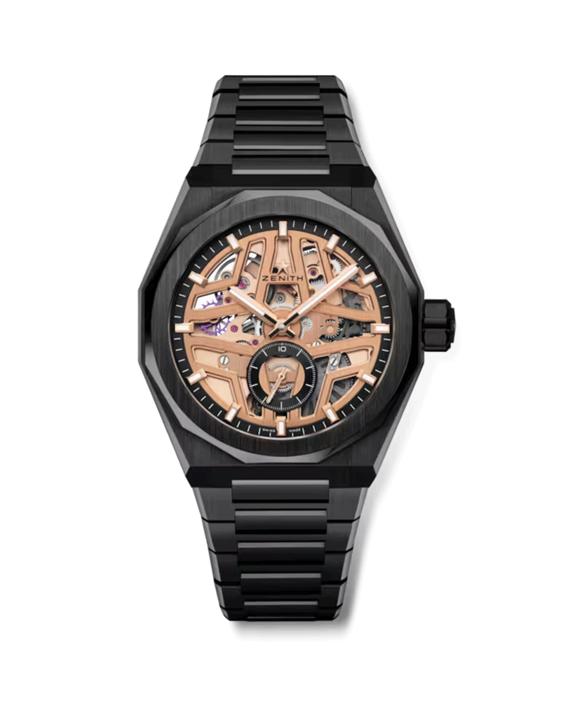 その新作となる、建造物と光が絶え間なく交錯する現代の都市景観から着想を得たデファイ スカイライン スケルトンは、スケルトンウォッチの可能性に全く新しい世界を切り開いています。1960年代の初期のデファイ モデルの八角形の形状から着想を得た、デファイ スカイライン スケルトンの角張ったスチール製ケースは、先駆モデルと同じ堅牢性と耐久性に優れたDNAを受け継ぎながらも、よりエッジの効いた構築的なデザインとなっています。調和の取れた左右対称のオープン文字盤は、1960年代のゼニスの「ダブルZ」ロゴを彷彿とさせる、4つの点を結んだ星の形をしています。高振動自動巻エル・プリメロ キャリバーは、常に動き続ける1/10秒単位のセコンドカウンターを備えています。エル・プリメロ 3620 ムーブメント